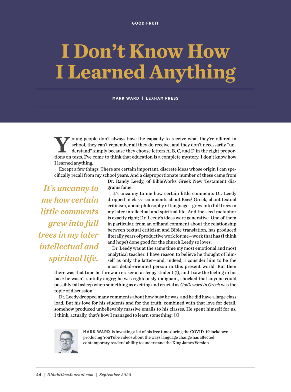 My former student and former fellow church member published this very touching tribute in the September, 2020 issue of the Logos theological journal, Didaktikos, When you read about the thrown eraser, please suspend judgment until you can read my explanation below! Thank you, Mark; you have been a blessing to me in many ways!